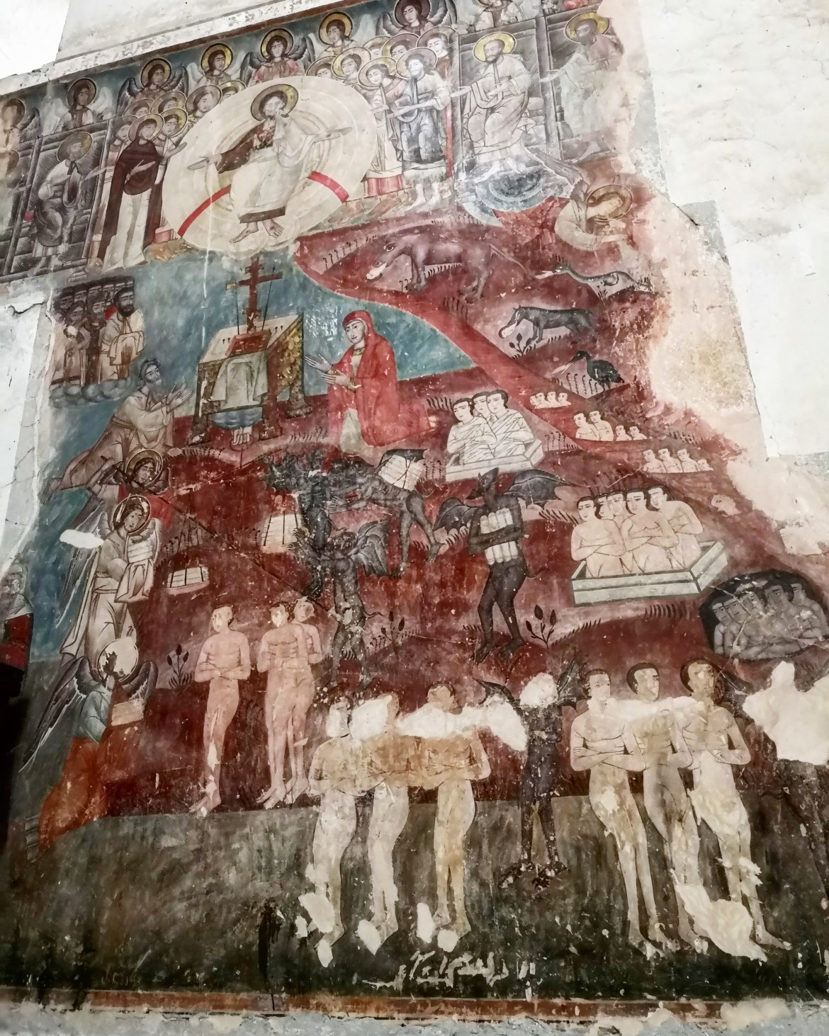 Silindir anıtın içinde, canlı renklere sahip bir duvar resmi, Gürcü ve Rus tarihlerinden yoğun bir şekilde stilize edilmiş sahneleri tasvir ediyor. Şeytan Vadisine açılan taş kemer, isim potansiyel olarak yanıltıcı olsa da ziyaretçilere pastoral bir manzara sunuyor.